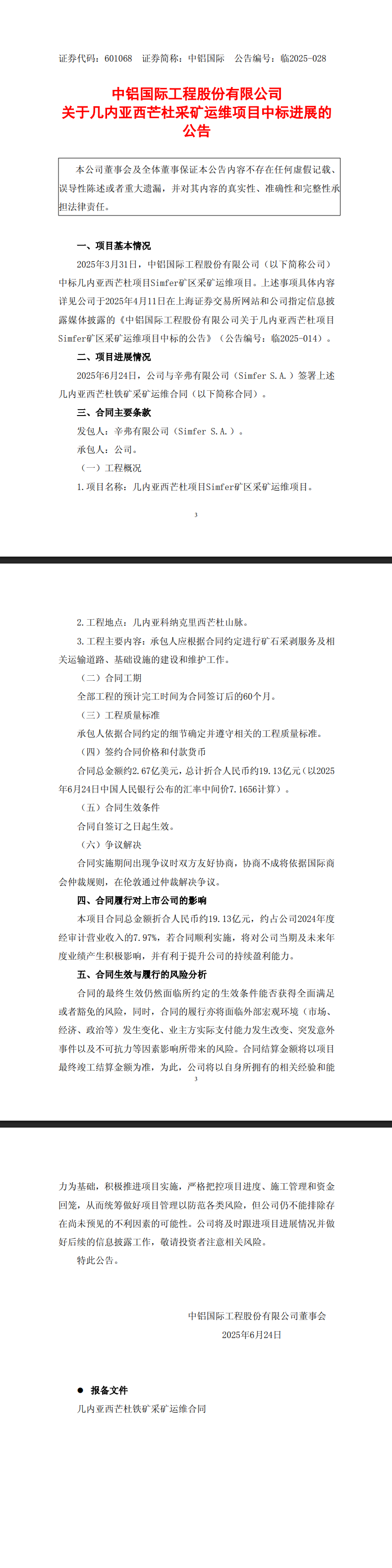 中鋁國際工程股份有限公司2025年6月25日發(fā)布關(guān)于幾內(nèi)亞西芒杜采礦運(yùn)維項(xiàng)目中標(biāo)進(jìn)展的公告顯示,2025年3月31日,中鋁國際工程股份有限公司(以下簡稱公司)中標(biāo)幾內(nèi)亞西芒杜項(xiàng)目Simfer礦區(qū)采礦運(yùn)維項(xiàng)目。2025年6月24日,公司與辛弗有限公司(Simfer S.A.)正式簽署該鐵礦采礦運(yùn)維合同。合同主要條款如下:發(fā)包方為辛弗有限公司(Simfer S.A.),承包方為公司。項(xiàng)目名稱為幾內(nèi)亞西芒杜項(xiàng)目Simfer礦區(qū)采礦運(yùn)維項(xiàng)目,工程地點(diǎn)位于幾內(nèi)亞科納克里西芒杜山...